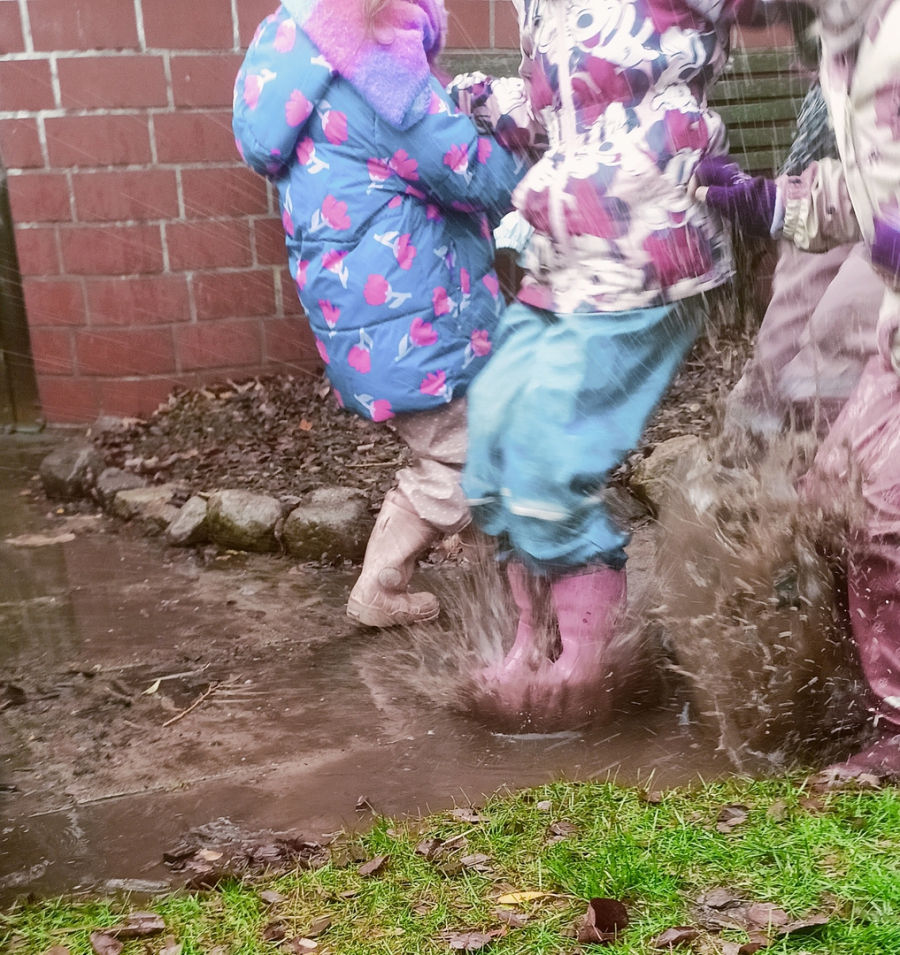 Der Sommer stand unter dem Hauptthema "Wahrnehmung" und so gab es viel zu tun in Sachen hören, sehen, fühlen etc. Das Foto zeigt ein gutes Beispiel zu diesem Thema, auch wenn es jetzt schon herbslich ist. Wetter lässt sich für die Kinder am besten draußen fühlen, und Pfützen machen natürlich besonders viel Spaß. Wir sind (beinahe jeden Tag an der frischen Luft und verbinden dies auch mit unserem aktuellen Thema im Haus: "Bewegung".